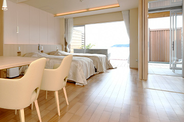 露天⾵呂付のお部屋やベッド付の和室やモダンな洋室まで、過ごし⽅に合わせてお部屋が選べます。